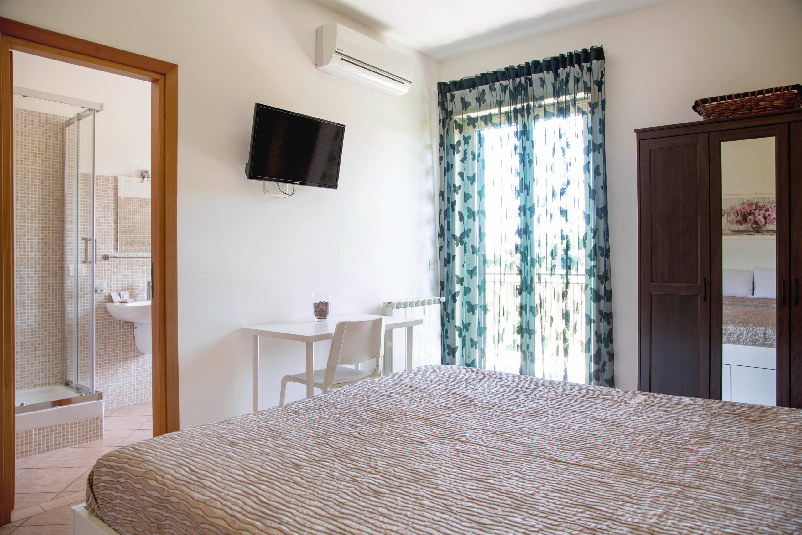 E’ una camera matrimoniale dal colore pastello vivace sulla tonalità gialla, che può prestarsi a diverse possibilità nella composizione dei posti letto grazie ad un comodo divano dotato di un materasso confortevole adatto a regalarvi un adeguato riposo. Glicine è molto luminosa, con bagno privato accessoriato con asciugacapelli e kit di cortesia (shampoo, bagno doccia e asciugamani) per un piacevole e tranquillo soggiorno da due a quattro persone. Un ampio balcone condiviso in continuità con la zona living invita ad una colazione al vostro risveglio con vista sul maestoso vulcano Etna!